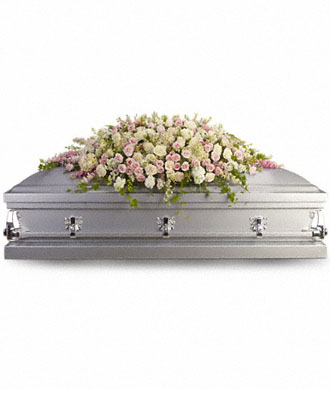 Nos fleuristes locaux conçoivent soigneusement la gerbe de cercueil Toujours Adorée en utilisant des roses blanches, des hortensias roses, des waxflowers, des delphiniums, des fougères, du lierre et de l'eucalyptus. Les teintes subtiles de blanc et de rose ajoutent une touche de tranquillité et de paix au lieu. Cette gerbe de cercueil époustouflante peut aider à atténuer une partie du chagrin et est une excellente façon d'honorer la mémoire de votre être cher décédé.